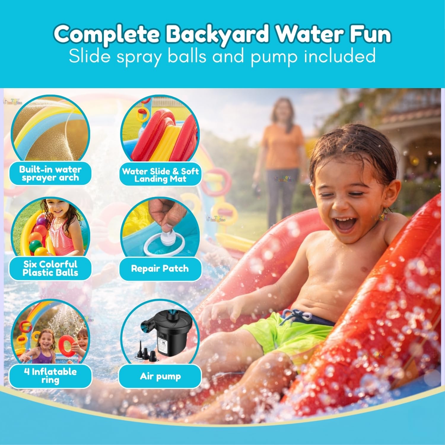 • Bright, colorful inflatable splash play center with slide, sprayer fountain, and balls—perfect for active summer fun and safe backyard water play.