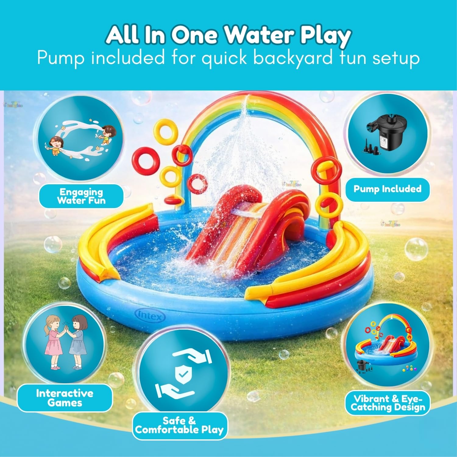 Escape the summer heat with the Toy ImagineRainbow Ring Play Center! Transform your backyard into the favorite neighborhood hangout this summer with the Toy Imagine Rainbow Ring Play Center. You will love the Slippery Water Slide, Raging Ring Toss Game, and all the Super Fun Ball Games included in this mini Water Park.